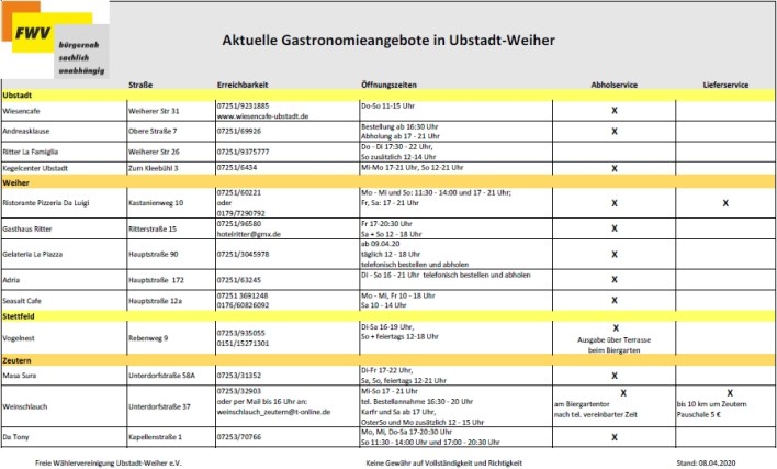 Wir wünschen unseren örtlichen Gastronomen, dass sie gut durch die aktuelle Zeit kommen. Hierbei können die Bürgerinnen und Bürger von Ubstadt-Weiher unterstützen, inem sie von den Angeboten fleissig Gebrauch machen!