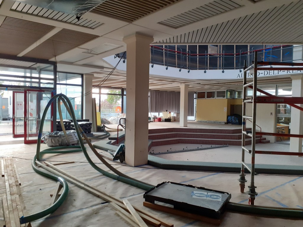 Trotz so mancher Herausforderung, wie z. B. Arbeiten unter Pandemiebedingungen, Schadstoffen, aufwendiger Mülltrennung, kurzfristigen Umplanungen oder unerwarteten Leitungen im Erdreich, liegen die Arbeiten im Zeitplan. Das Entkernen rund um die Aula hat sichtbare Fortschritte gemacht. Die Räumlichkeiten in der oberen Etage sind verhüllt, damit vor der fachgerechten Entsorgung keine Schadstoffe nach außen gelangen.