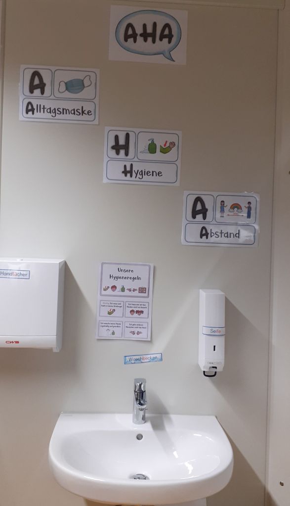 Ebenfalls besichtigt wurden die „Containerklassenzimmer“, die für zehn Klassen eingerichtet wurden. Hier bestand die Herausforderung, in der ohnehin schon ungewöhnlichen Umgebung mit Baustellencharme, die Klassenzimmer trotz der beengten Verhältnisse in den Containern behaglich und auch „Coronagerecht“ einzurichten. Es mussten z. B. nachträglich Waschbecken in den Klassenräumen installiert werden.