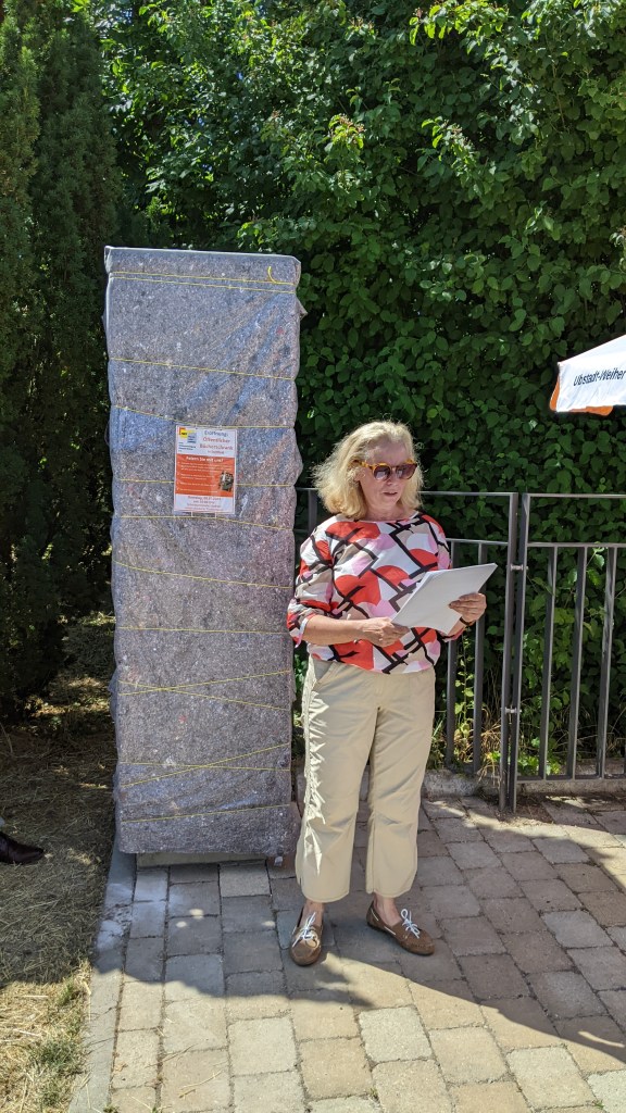 Wie schon erwähnt, steht der öffentliche Bücherschrank unter der Schirmherrschaft unseres Bürgermeisters Tony Löffler. Ich möchte Bürgermeister Löffler und der Gemeindeverwaltung unseren herzlichen Dank aussprechen für die Unterstützung und Anerkennung des Projekts. Die Übernahme der Schirmherrschaft und die gute Zusammenarbeit bei der Umsetzung dieses Projektes sind ein Zeichen für das Engagement und die Wertschätzung gegenüber der Kultur und Bildung in unserer Gemeinde.