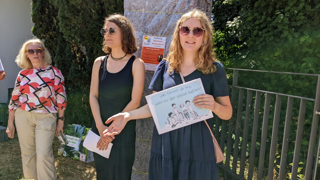 Und nun, bevor wir den Bücherschrank mit Hilfe des Schirmherrn enthüllen, möchte ich Sie alle einladen, die Buchpräsentation von Leonie Schwarz und Merle Dopfer zu genießen.